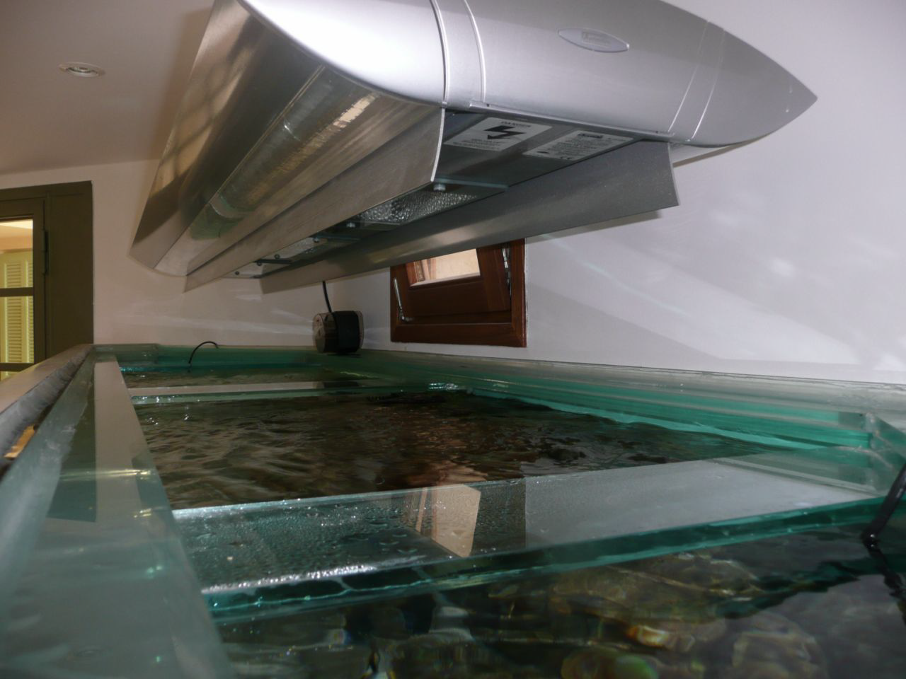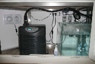 Filtration à décantation sous l'aquarium avec réserve d'eau et remise à niveau automatique, climatisation et extracteur d'air